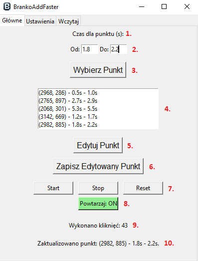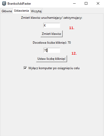 - Zapętla czynność klikania, w przypadku włączenia ustaw przed włączaniem programu włączanie/wyłączanie na przycisk w Ustawieniach! (11)